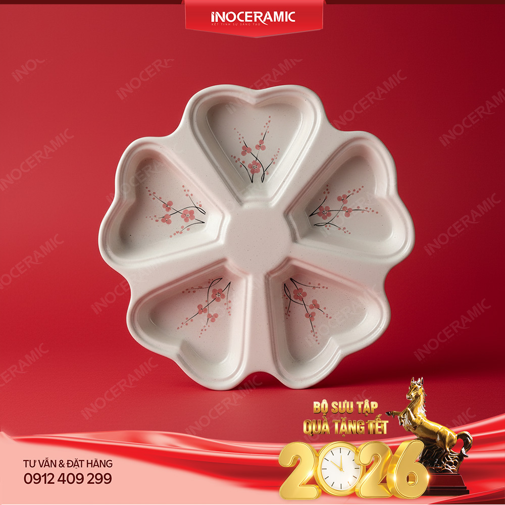 Khay đựng mứt Đào Hồng được thiết kế gồm 5 ngăn trái tim liền khối, tạo thành hình một bông hoa đào nở rộ – hình ảnh biểu tượng của mùa xuân, của sự khởi đầu may mắn và thịnh vượng. Kiểu dáng mềm mại giúp khay mứt trở thành điểm nhấn nổi bật trên bàn trà, bàn tiếp khách hay không gian phòng khách ngày Tết. Từng ngăn đều có nắp đậy chắc chắn, giúp bảo quản mứt Tết, ô mai, bánh kẹo, hạt dinh dưỡng luôn sạch sẽ và thơm ngon.
