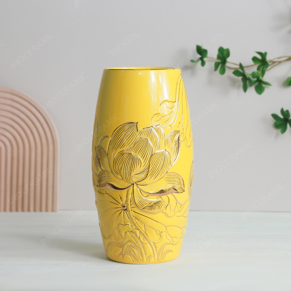 Sản phẩm được tạo hình theo dáng lọ bom cổ điển là một dáng lọ truyền thống thể hiện sự vững vàng, ổn định và bền bỉ. Toàn bộ phần thân được phủ men vàng ánh kim, tạo hiệu ứng ánh sáng lung linh, sang trọng và rất phù hợp để trưng bày trong các không gian trang trọng như phòng họp, sảnh cơ quan hay phòng làm việc của lãnh đạo.