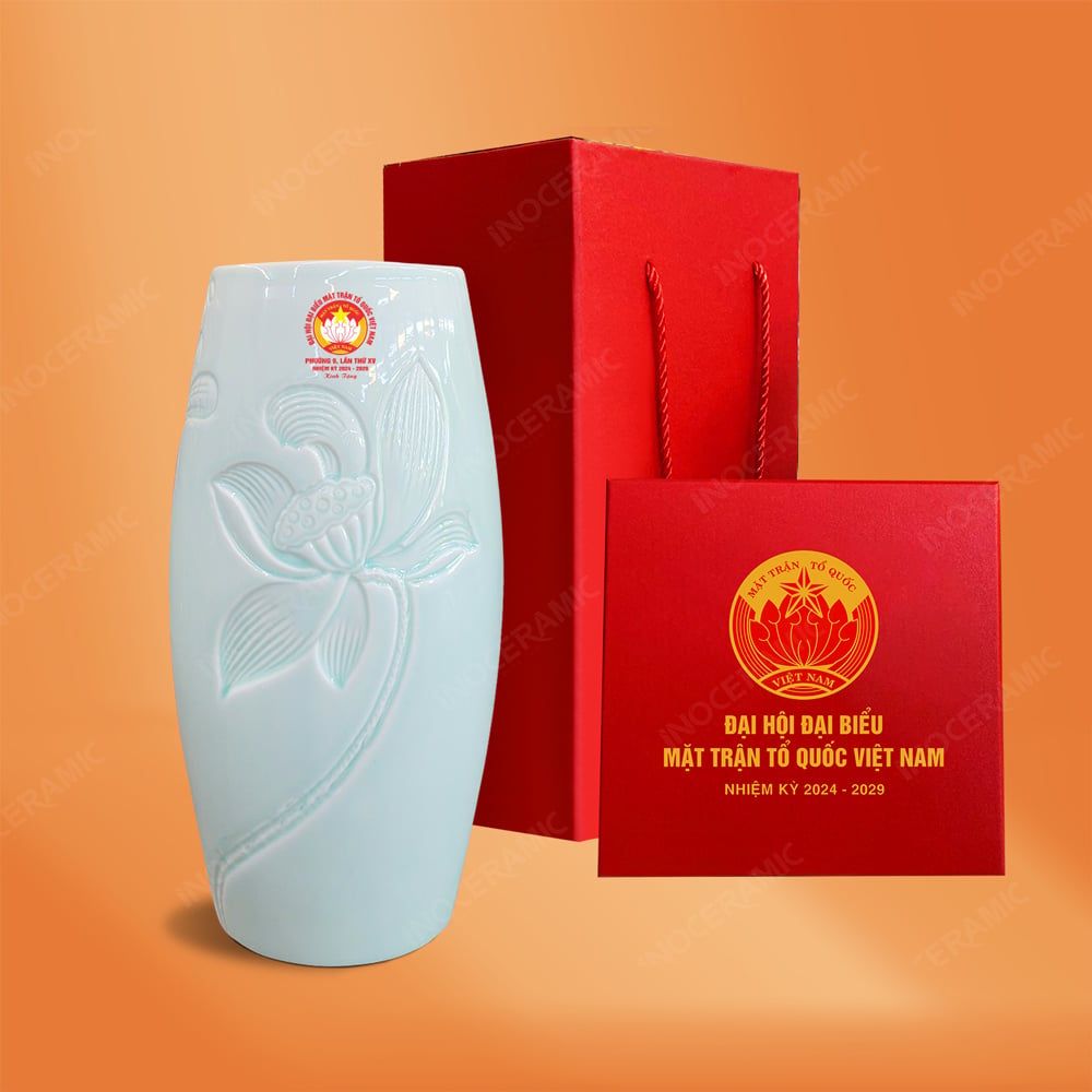 Lọ hoa bom men ngọc khắc sen H27 mang vẻ đẹp trang nhã và biểu tượng cho sự thanh cao, hòa hợp. Họa tiết hoa sen được khắc tay tinh xảo, phủ men ngọc sáng trong, tôn lên giá trị nghệ thuật và phong thủy. Sản phẩm gốm sứ Bát Tràng cao cấp in logo Đại hội Mặt Trận Tổ Quốc (MTTQ), thích hợp làm quà tặng lưu niệm trang trọng.