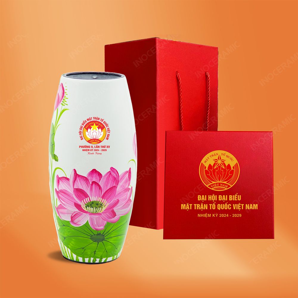 Lọ hoa bom sơn mài vẽ sen in logo quà tặng Đại hội Mặt Trận Tổ Quốc CAM KẾT: “Đừng chỉ tặng một món quà – hãy trao một giá trị văn hoá.”