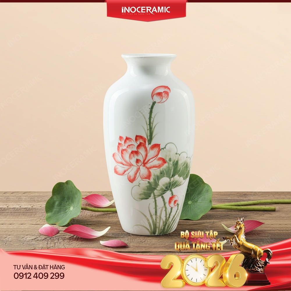 Lọ hoa Hồng Liên Thanh Ngọc là một trong những tác phẩm nghệ thuật nổi bật trong bộ sưu tập quà Tết 2026 của Inoceramic – Gốm Sứ Sáng Tạo.