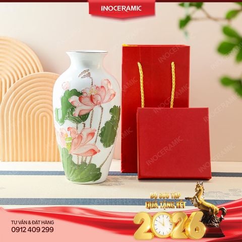 Lọ hoa Liên Hoa Tịnh Ngọc là một trong những mẫu lọ hoa Tết cao cấp thuộc bộ sưu tập quà Tết 2026 của Inoceramic – Gốm Sứ Sáng Tạo. Được chế tác hoàn toàn thủ công bởi nghệ nhân làng gốm Bát Tràng, sản phẩm mang trên mình lớp men trắng ngọc tinh khiết và họa tiết hoa sen hồng mềm mại, biểu trưng cho sự thanh cao, tịnh tâm và viên mãn.