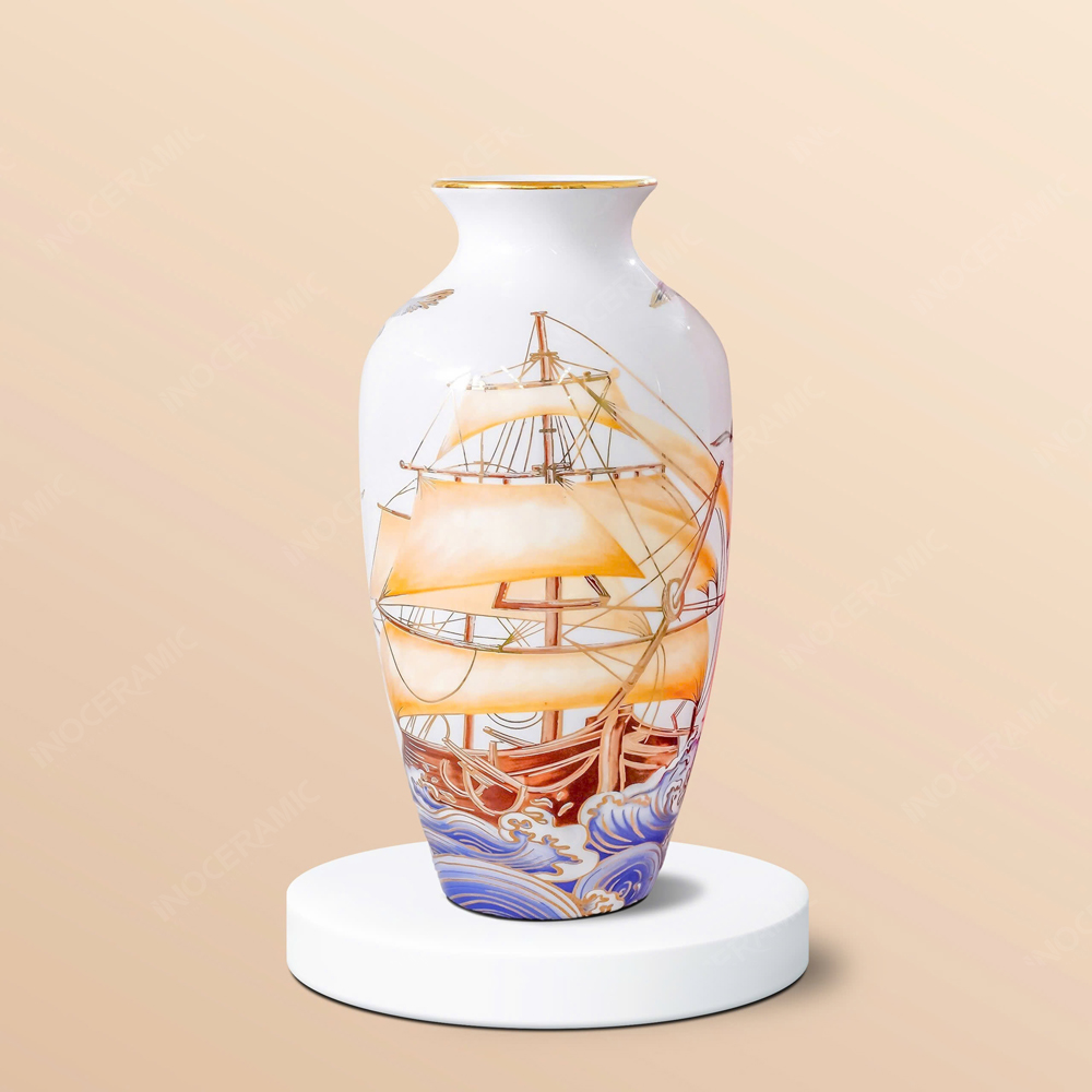 Hình ảnh thuyền buồm, tượng trưng cho sự thuận buồm xuôi gió, gắn liền với ý nghĩa phong thủy về sự thành công, thuận lợi trong công việc và cuộc sống. Các chi tiết kẻ vàng tạo thêm vẻ quý phái, làm tôn lên sự thanh thoát của lọ hoa, đồng thời mang lại sự may mắn và tài lộc cho gia chủ. Lọ hoa Thuận buồm kẻ vàng được chế tác từ chất liệu gốm sứ cao cấp, với lớp men bóng mượt, giúp giữ gìn vẻ đẹp lâu dài và bền vững theo thời gian.