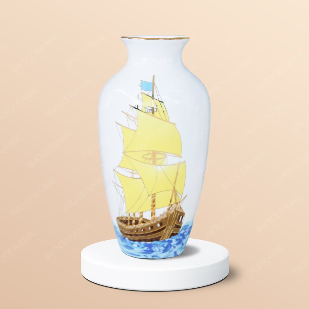 Điểm đặc biệt của lọ hoa chính là họa tiết thuận buồm xuôi gió, một biểu tượng phong thủy mang lại sự thuận lợi, may mắn và thành công trong công việc, cuộc sống. Họa tiết được vẽ tỉ mỉ với các đường nét sắc sảo, kết hợp với phần kẻ vàng sáng bóng chạy quanh thân lọ, tạo nên một sự tương phản hoàn hảo giữa nền gốm sứ và các chi tiết trang trí. Sắc vàng tượng trưng cho sự thịnh vượng, tài lộc, giúp mang đến một không gian không chỉ đẹp mắt mà còn đầy ý nghĩa phong thủy.