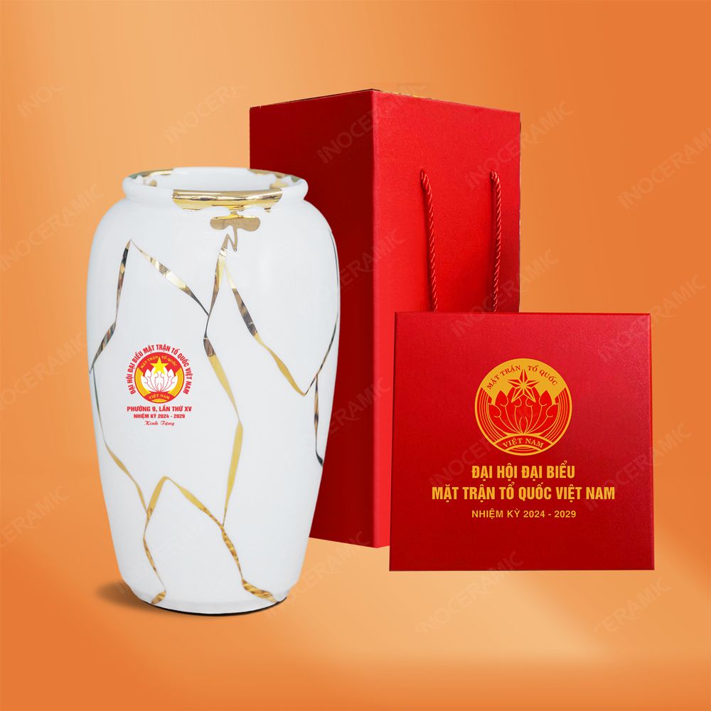 Lọ hoa trắng vẽ vàng in logo quà tặng Đại hội Mặt Trận Tổ Quốc CAM KẾT: “Đừng chỉ tặng một món quà – hãy trao một giá trị văn hoá.”