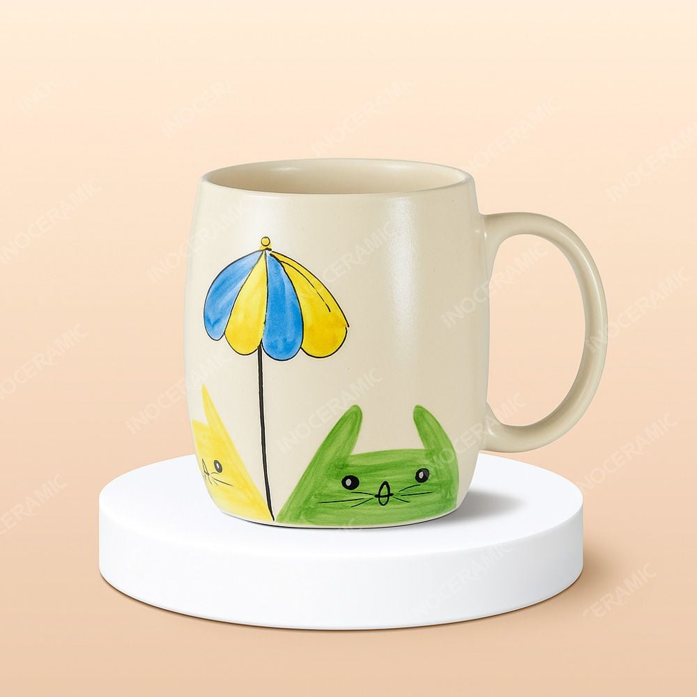 Ly sứ trứng đại Mèo Dưới Ô là sản phẩm gốm Bát Tràng độc đáo, lấy cảm hứng từ hình ảnh chú mèo dễ thương nép dưới chiếc ô xinh xắn. Dáng ly tròn lớn, men sứ mịn, giữ nhiệt tốt, phù hợp in logo theo yêu cầu. Đây là món quà tặng lý tưởng cho khách hàng, nhân viên văn phòng, mang đến cảm giác ấm áp, thân thiện và góp phần lan tỏa thương hiệu một cách đáng nhớ.