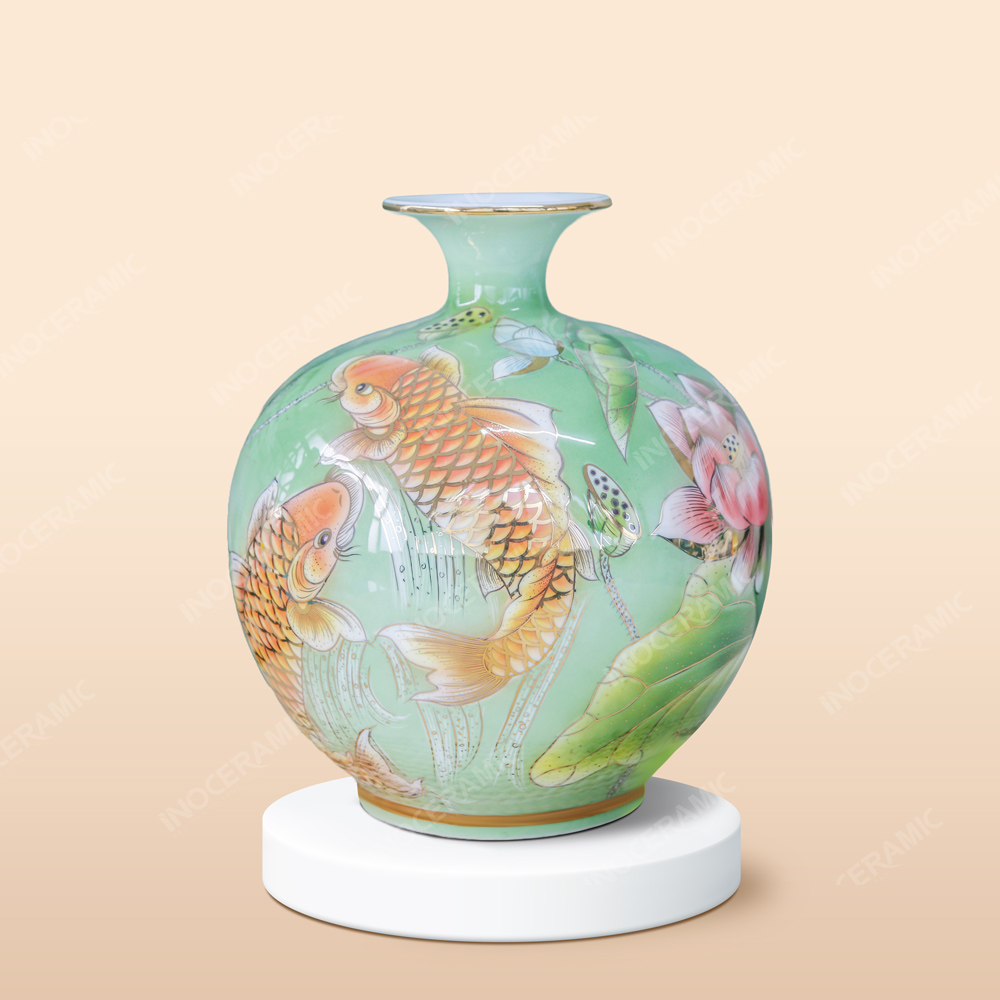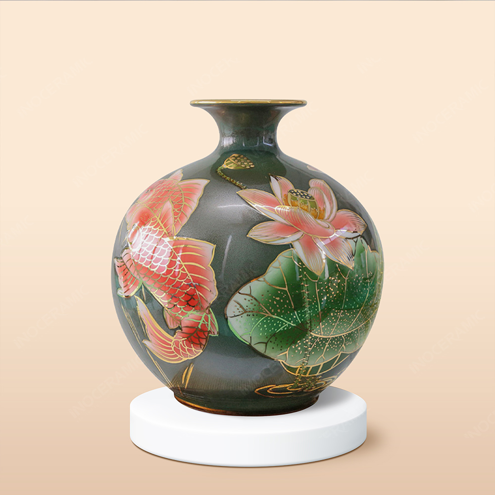 Điểm nhấn nổi bật chính là hoạ tiết cá chép vẽ vàng bơi trong không gian sen nở biểu tượng cho sự kiên trì, bền chí, vươn lên thành công kết hợp với hình ảnh thanh cao, thuần khiết của hoa sen phú quý. Tất cả được khắc họa trên nền men màu sang trọng, tạo chiều sâu thị giác và cảm giác ấm áp khi trưng bày.