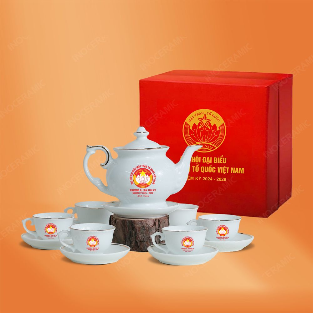 Bộ ấm trà Đài Các kẻ chỉ vàng in logo là quà tặng Đại hội Đại biểu nhiệm kỳ 2025-2030 mang vẻ đẹp trang nhã, sang trọng. Thiết kế tinh tế, đường nét thanh thoát, viền chỉ vàng nổi bật trên nền men sứ cao cấp giúp sản phẩm trở thành món quà tặng tri ân ý nghĩa, ghi dấu ấn thương hiệu và tôn vinh giá trị văn hóa trong các sự kiện trọng đại.
