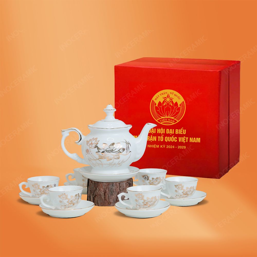 Bộ ấm trà Đài Các miệng lượn sen vàng vẽ vàngquà tặng gốm sứ Đại hội Mặt trận Tổ quốc nhiệm kỳ 2025-2030 mang vẻ đẹp sang trọng và ý nghĩa đoàn kết. Dáng ấm mềm mại, họa tiết sen vàng vẽ tay tinh tế, điểm chỉ vàng cao cấp – món quà lưu niệm Đại hội MTTQ trang nhã, bền đẹp và giàu giá trị tri ân.