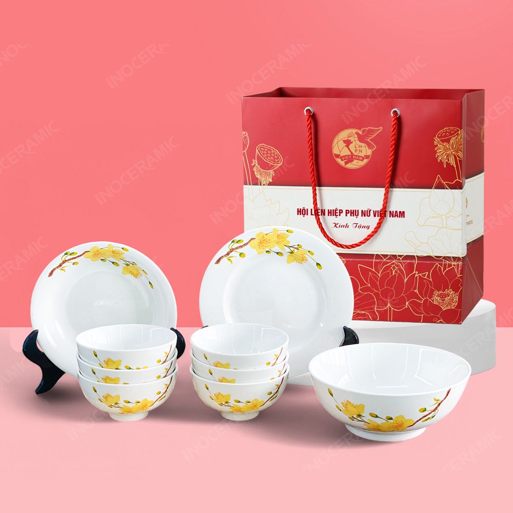 • Tên sản phẩm: Quà tặng phụ nữ - Bộ bát đĩa đồ ăn 9 món hoa mai in logo