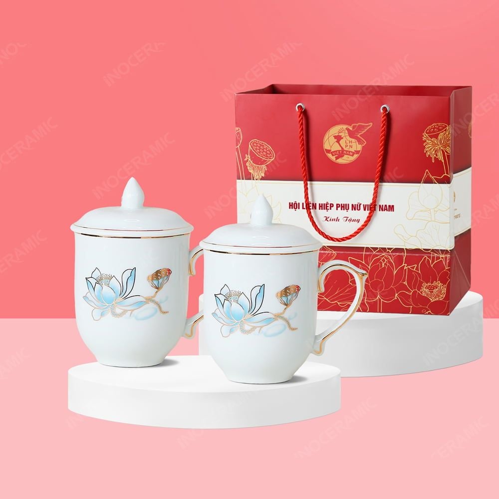 Quà tặng phụ nữ - Giftset 02 ly sứ Bát Tràng nắp ngọn lửa sen xanh kẻ vàng in logo mang nét đẹp tinh tế, sang trọng và ý nghĩa. Bộ sản phẩm là lựa chọn quà tặng phụ nữ lý tưởng để doanh nghiệp tri ân nhân viên nữ, khách hàng, công đoàn viên, đồng thời khẳng định thương hiệu bền vững.