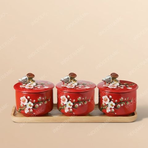 🎁 Set 03 hũ mứt men đỏ Hoa Đào đắp nổi Bát Tràng – Quà Tết doanh nghiệp sang trọng, đậm sắc xuân