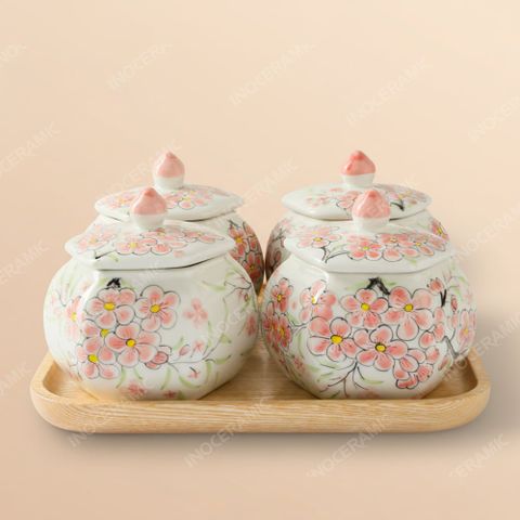 Set 4 hũ mứt lục giác bầu Indochine Đào Hồng với họa tiết hoa đào hồng vẽ tay của gốm sứ Bát Tràng là lựa chọn quà tặng tinh tế và vô cùng ý nghĩa dành cho doanh nghiệp trong mùa Tết. Với kiểu dáng độc đáo mang phong cách Indochine, đường nét mềm mại kết hợp họa tiết đào hồng rực rỡ biểu tượng cho khởi đầu may mắn và sự sum vầy, bộ sản phẩm nhanh chóng trở thành lựa chọn hàng đầu khi doanh nghiệp cần quà tặng tri ân cho khách hàng, đối tác, tổ chức, hiệp hội và cơ quan đoàn thể. Xu hướng quà Tết, set quà Tết, hộp quà Tết in logo luôn đòi hỏi sự tinh tế, độc đáo và mang giá trị sử dụng thật – và bộ hũ mứt Đào Hồng đáp ứng hoàn hảo tất cả.