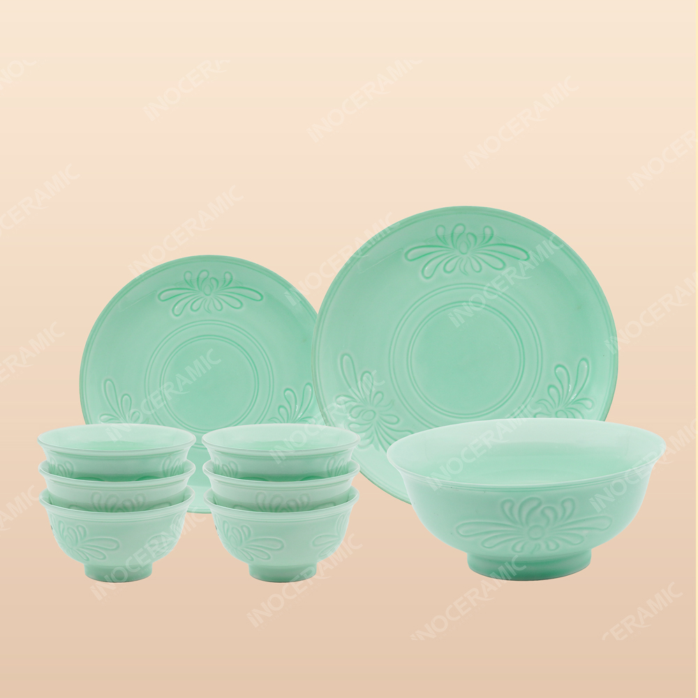 Bộ bát đĩa 9 món men ngọc kẻ vàng là sự kết hợp giữa nghệ thuật thủ công truyền thống và tính hiện đại. Từng chi tiết được tạo hình, vẽ màu, phủ men thủ công, đảm bảo tính đồng nhất và độ tinh xảo.