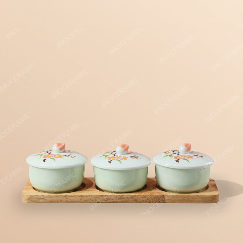 Set hũ đựng mứt Hồng Đào Phú Quý men ngọc gốm sứ Bát Tràng là một trong những thiết kế quà tặng Tết nổi bật năm nay, kết hợp vẻ đẹp truyền thống của hoa đào Việt Nam với sự sang trọng của men ngọc cao cấp. Bộ sản phẩm gồm ba hũ đựng mứt đặt trên khay gỗ tự nhiên, phù hợp bày trên bàn phòng khách hoặc đóng gói vào hộp quà Tết và set quà Tết dành cho doanh nghiệp tri ân khách hàng – đối tác. Sự hài hòa giữa màu sắc và họa tiết khiến bộ hũ mứt không chỉ là vật dụng lưu trữ mà còn là một sản phẩm trang trí mang đậm giá trị văn hóa ngày xuân.