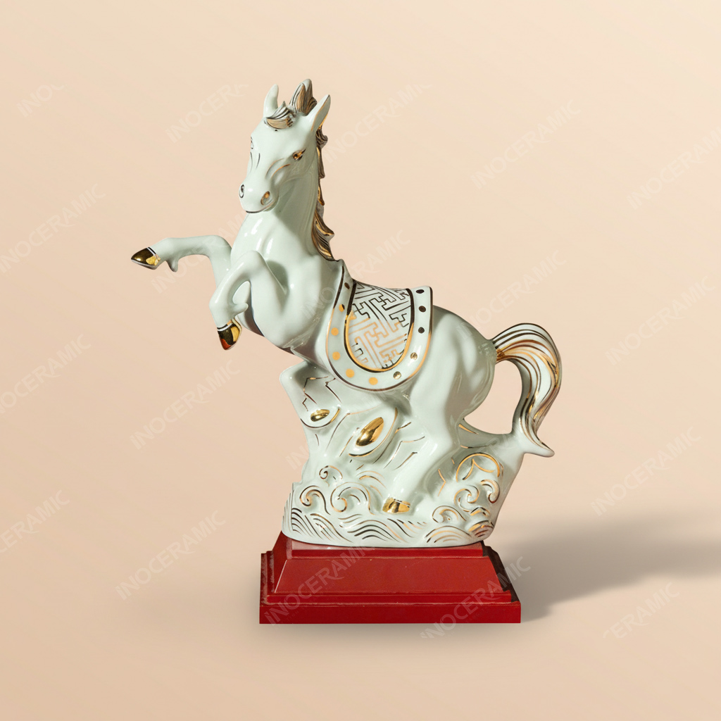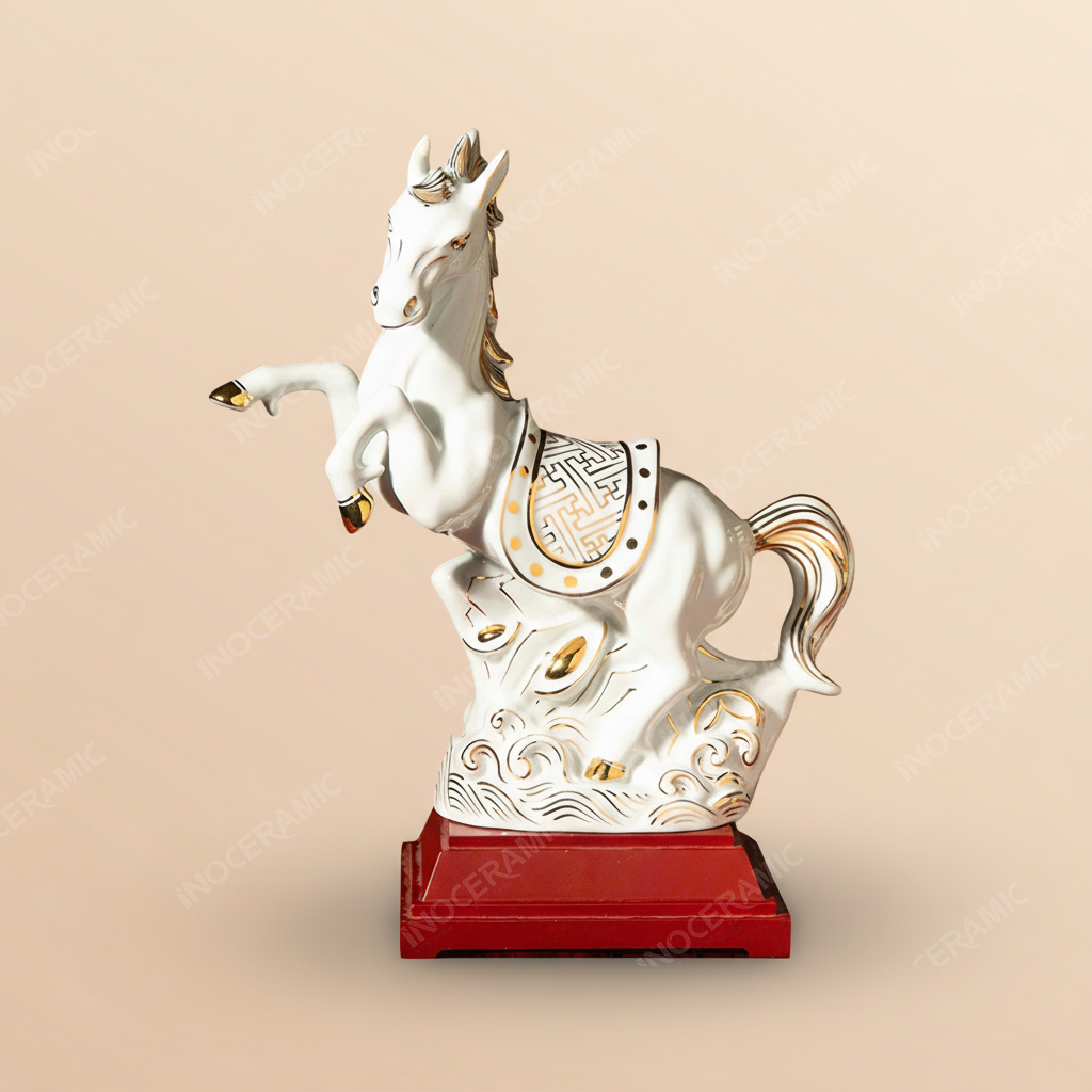 Tượng được phủ lớp men trắng cao cấp, trong sáng, mịn màng và có độ bóng sang trọng, tạo nền hoàn hảo cho các chi tiết vẽ vàng 24K nổi bật. Đường nét vàng trên bờm ngựa, yên ngựa, vó ngựa và họa tiết sóng cuộn dưới chân được nghệ nhân xử lý tỉ mỉ, tạo nên vẻ đẹp tinh tế, quý phái mà những dòng tượng công nghiệp khó có thể đạt được.