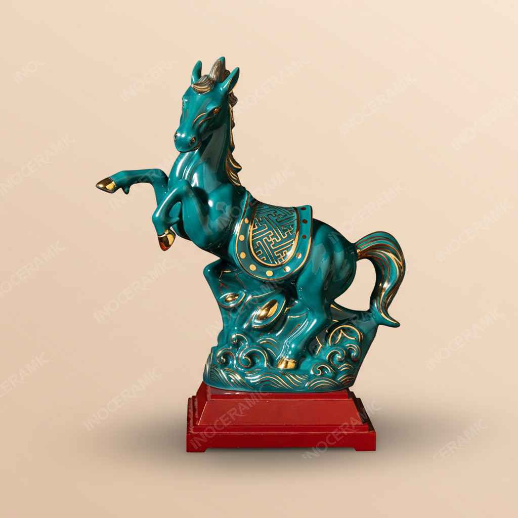 Tượng Chiến Mã Khải Hoàn được sản xuất tại xưởng gốm sứ Bát Tràng, nơi hội tụ kỹ nghệ tạo hình và nung men hàng trăm năm tuổi. Từng chi tiết – từ cơ bắp thân ngựa, dáng bờm bay, ánh mắt kiên cường đến nền sóng cuộn dưới chân – đều được nghệ nhân nặn thủ công, đảm bảo sự sống động và tinh xảo.