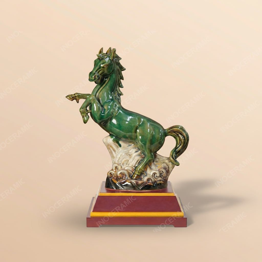 Từng chi tiết cơ bắp, bờm, chân, đế sóng đều được nghệ nhân tạo hình tinh tế, thể hiện đẳng cấp của một tác phẩm tượng gốm sứ nghệ thuật.