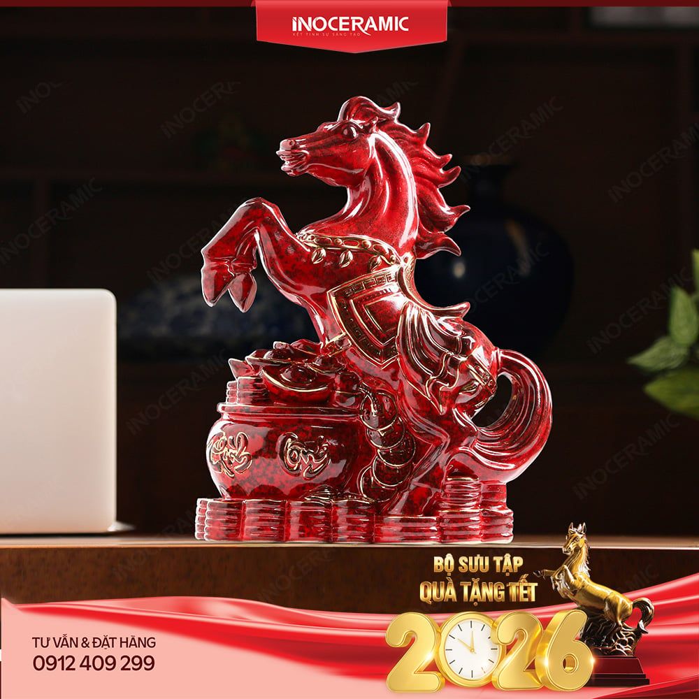 Tượng ngựa Xích Mã Tài Lộc nổi bật với sắc đỏ gốm hỏa biến rực rỡ, biểu trưng cho may mắn, danh vọng và thành công rực rỡ.