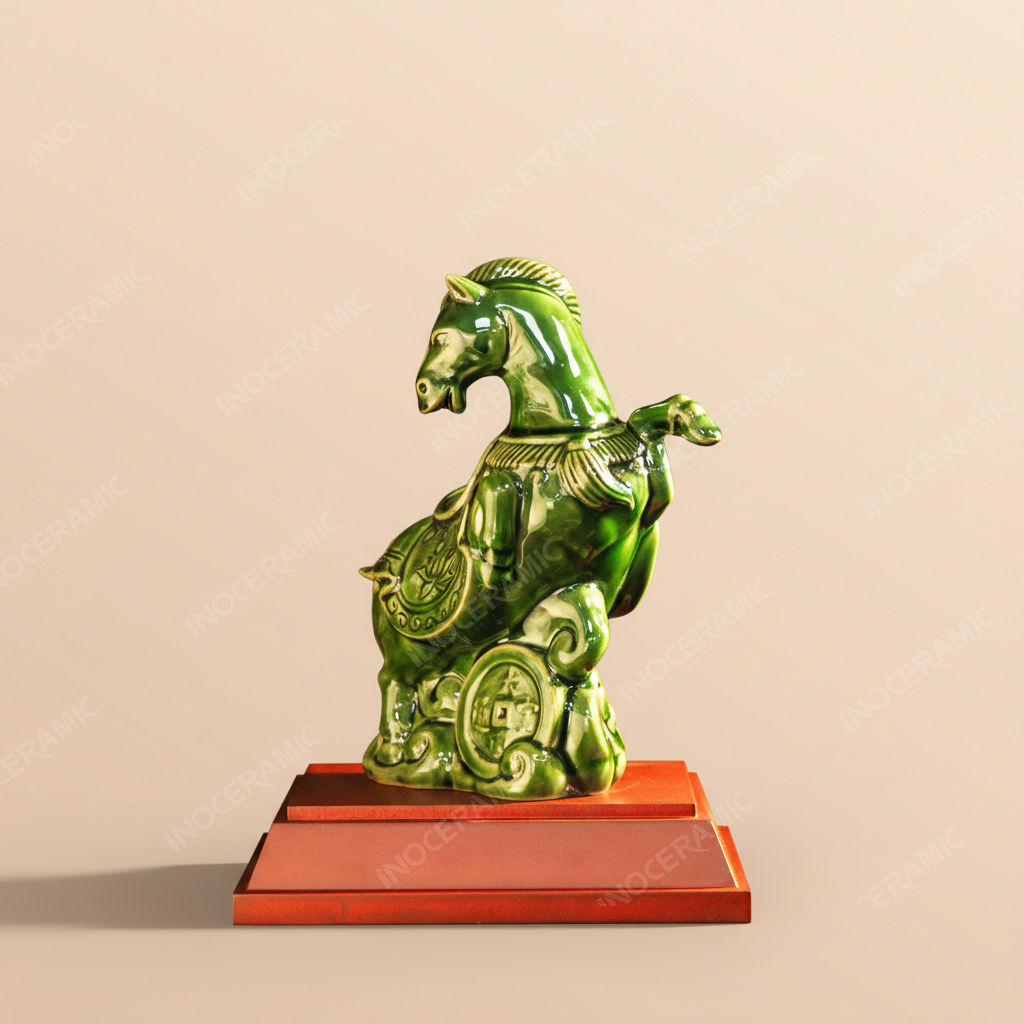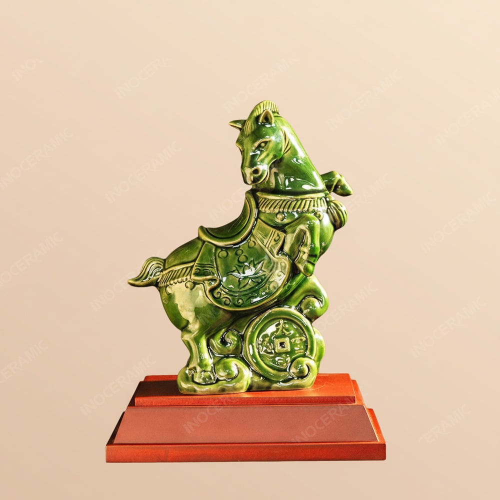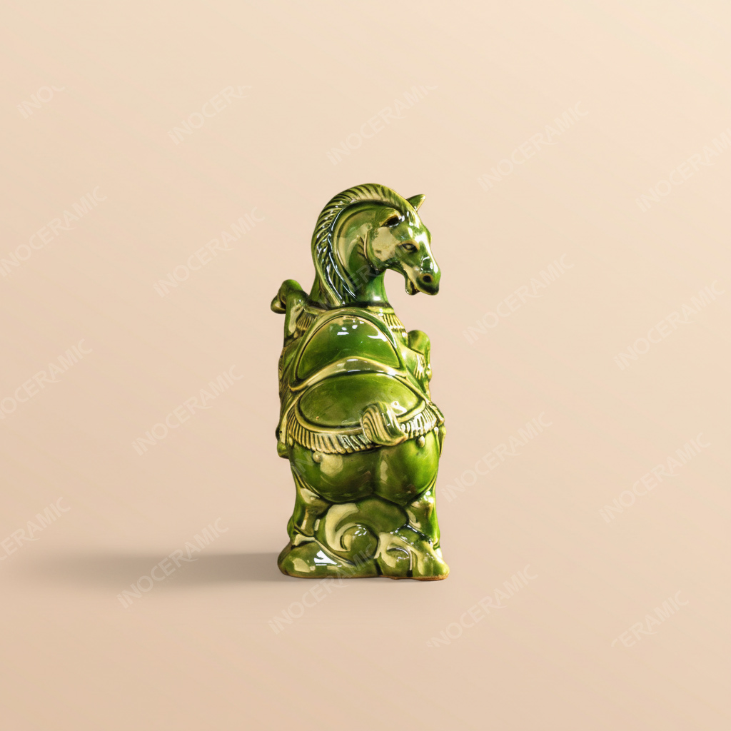 Điểm nhấn nổi bật của tượng là sắc men ngọc lục – gam màu xanh ngọc sâu sang trọng, tượng trưng cho sự sinh sôi, phát triển và trường tồn. Trong phong thuỷ, màu xanh lục thuộc hành Mộc, tương sinh với người mệnh Mộc và Hỏa, giúp kích hoạt tài khí, mang lại may mắn trong sự nghiệp và kinh doanh. Khi trưng bày trong văn phòng, phòng làm việc hoặc quầy lễ tân, tượng ngựa men lục ngọc tạo điểm nhấn nghệ thuật và thu hút năng lượng tích cực.