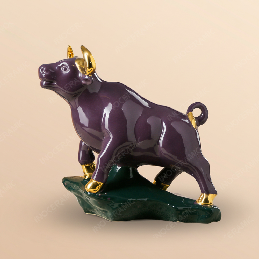 Được tạo tác từ bàn tay nghệ nhân tại xưởng gốm sứ Bát Tràng, tượng trâu Kim Giáp Ngưu thể hiện rõ nét tinh hoa của làng nghề hàng trăm năm tuổi. Mỗi sản phẩm đều trải qua nhiều công đoạn công phu: tạo dáng thủ công, sửa nguội, tráng men, vẽ vàng và nung ở nhiệt độ cao để đạt độ bền tuyệt đối. Gốm sứ Bát Tràng nổi tiếng với dòng men ổn định, bóng mịn, lâu phai và luôn giữ được vẻ đẹp theo thời gian. Đây chính là lý do các doanh nghiệp lớn lựa chọn tượng gốm sứ Bát Tràng làm quà tặng phong thuỷ cho dịp Tết, như lời chúc năm mới hanh thông – vững tiến – thịnh vượng.